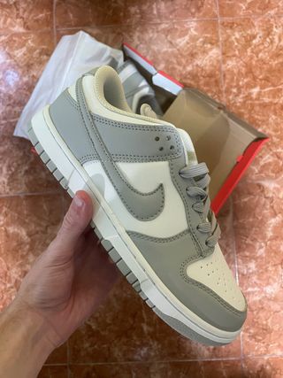 Zapatillas Nike Dunk con un diseño moderno en tonos grises y blancos. - Combinación de cuero y materiales sintéticos. - Suela de goma para mayor durabilidad. - Cordones a juego con el diseño. - Están como nuevas sin usar -Precio no negociable