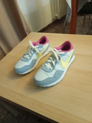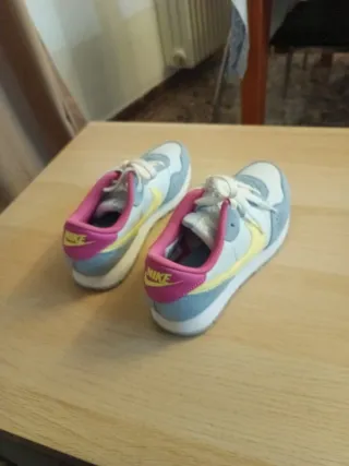 Zapatillas deportivas Nike en talla 36, con un diseño moderno y llamativo. - Combinación de colores azul claro, rosa y amarillo. - Cierre con cordones blancos. - Detalle de logo en el lateral.