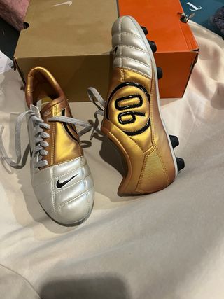 Botas de fútbol Nike Total 90 III en tonos dorados y plateados. Un modelo icónico para destacar en el campo. - Diseño llamativo en oro y plata. - Detalle '90' en el lateral. Las botas están totalmente nuevas a estrenar, increíble considerando que es una de las mejores de la historia y que tienen más de 20 años. Tienen los tacos de plástico y son muy cómodas. Cuenta con la caja original. Son las zapatillas Nike Total 90 III, un modelo icónico lanzado originalmente en 2004. Estas botas de fútbol, populares entre jugadores de élite de la época como Luis Figo o Wayne Rooney, se caracterizan por su diseño atrevido con cordones asimétr