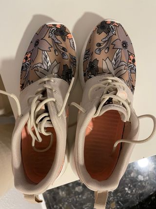 Zapatillas Nike con un diseño floral único en tonos tierra y detalles en coral. Perfectas para un estilo casual y llamativo. - Estampado floral. - Detalles en coral. - Diseño Roshe Run. Están prácticamente nuevas, ya que apenas las he usado (las compré pequeñas para mi pie).
