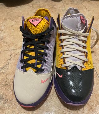 Zapatillas deportivas Nike LeBron James. - Diseño con detalles en morado y amarillo. - Puntera en color crema y negro con textura. - Swoosh en color rosa en ambos laterales.