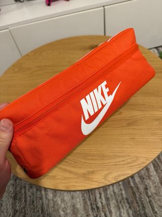 Práctica bolsa de viaje con el diseño de zapatillas Nike. - Color naranja y blanco. - Ideal para transportar zapatillas.
