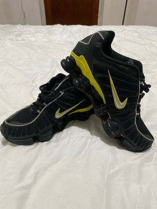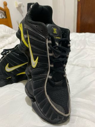 Zapatillas deportivas Nike Shox en color negro con detalles en amarillo. - Diseño moderno y llamativo. - Suela con tecnología Shox para mayor amortiguación. - Logo de Nike en el lateral.