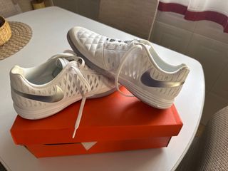 Zapatillas de fútbol sala Nike Lunar Gato. - Diseño en blanco y plateado. - Tecnología Lunar Gato. - Cierre con cordones.