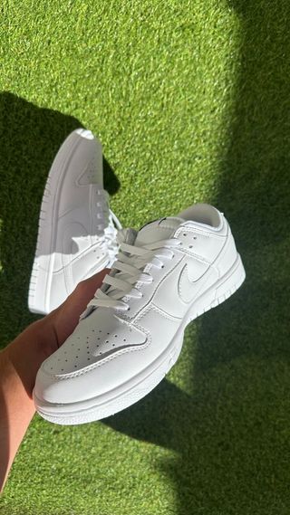 Zapatillas deportivas Nike Dunk de color blanco, talla 43. Diseño clásico y versátil. - Parte superior de cuero. - Suela de goma. - Cierre con cordones.
