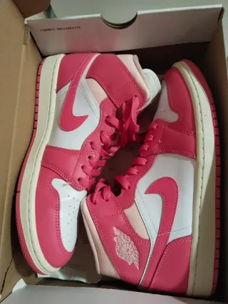 Zapatillas Nike Air Jordan 1 Mid en tonos rosa y blanco. - Diseño de caña media. - Detalles de Swoosh en contraste. - Logo Air Jordan en el lateral. Están nuevas y usadas un par de veces