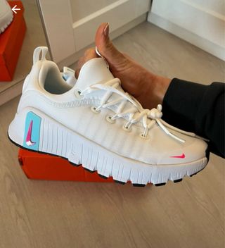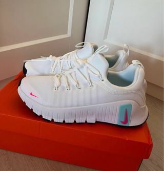 Zapatillas de entrenamiento Nike Free Metcon para mujer. - Diseño en color blanco con detalles en rosa y turquesa. - Logotipo de Nike en el lateral y en la lengüeta.