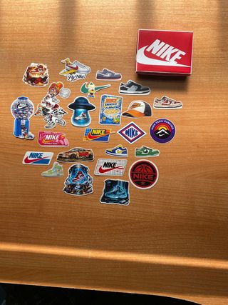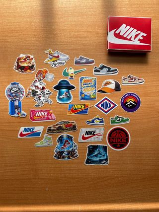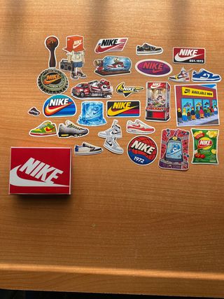 Lote de pegatinas de la marca Nike, con diseños variados y la caja original incluida. - Incluye caja de la marca. - Diseños de zapatillas y logos de Nike.