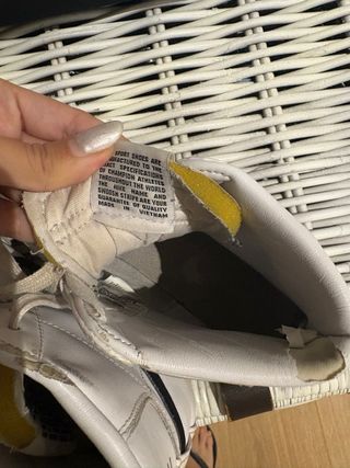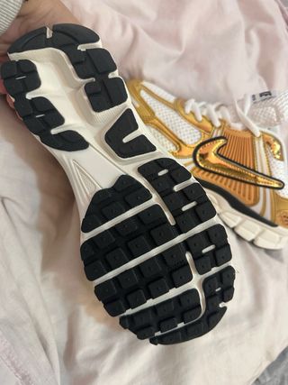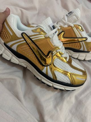 Zapatillas deportivas Nike Zoom Vomero 5 en tonos dorados y blancos. - Diseño con detalles metálicos. - Malla transpirable en la parte superior. - Suela con amortiguación. (repli) SIN CAJA