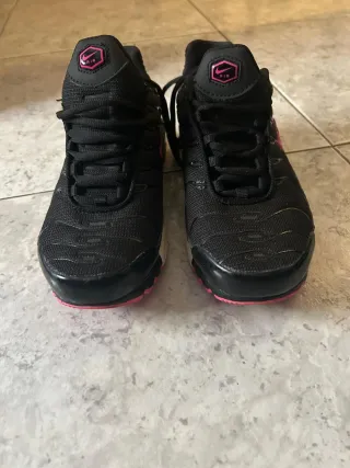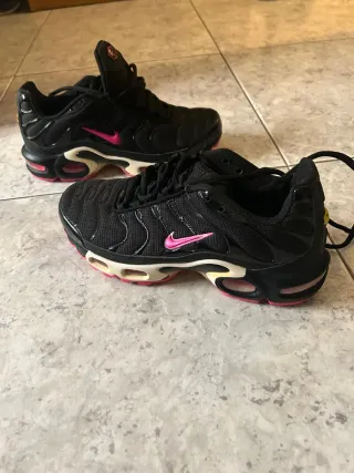Zapatillas Nike Air Max TN en color negro con detalles en rosa. - Diseño deportivo y moderno. - Suela con amortiguación visible. - Logotipo de Nike en el lateral.