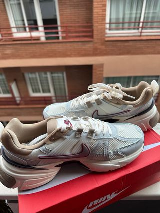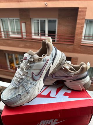 Zapatillas deportivas Nike V2k Run con un diseño moderno y cómodo. - Combinación de colores beige y blanco. - Detalles en burdeos y gris. - Suela con tecnología Cushion.
