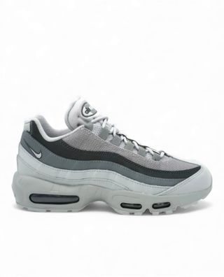 Zapatillas Nike Air Max 95 en color gris claro y gris ahumado. Diseño icónico con capas superpuestas. - Parte superior de malla y cuero. - Unidad Air Max visible en el talón y antepié. - Suela de goma para mayor tracción.