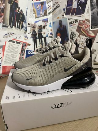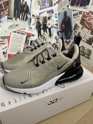 Zapatillas Nike Air Max 270 en color beige y negro. Diseño moderno y cómodo. - Unidad Air Max 270 visible en el talón. - Parte superior de malla transpirable. - Suela de goma para mayor durabilidad.