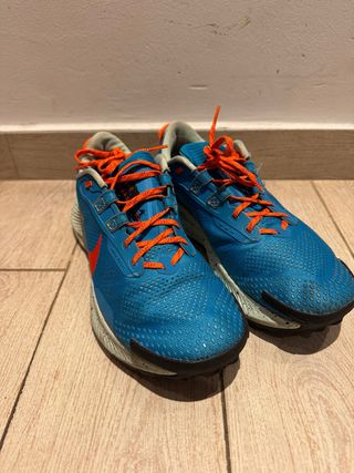 Zapatillas deportivas Nike Pegasus Trail 4 en talla 42. Perfectas para tus carreras. - Diseño en color azul con detalles naranjas. - Suela con motas blancas y negras.