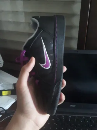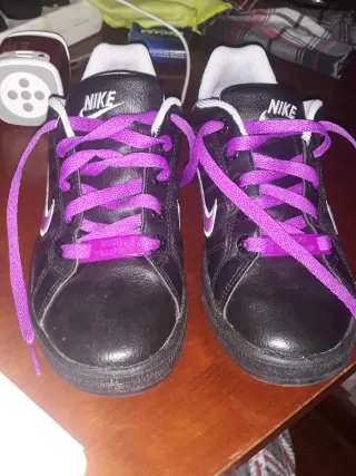 Zapatillas deportivas Nike en color negro con cordones morados. - Diseño clásico de caña baja. - Detalle del logo Swoosh en el lateral. - Cierre con cordones. - Suela de goma.