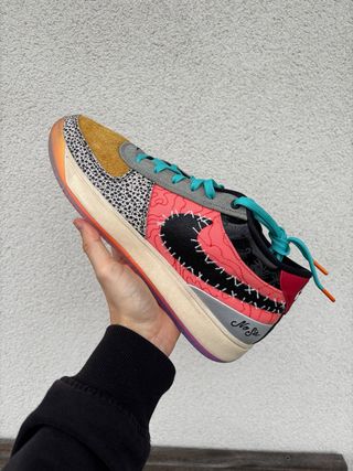 Zapatillas Nike Book 1 con un diseño What The que combina múltiples colores y texturas. Talla 47.5 - Combinación de materiales como piel de serpiente y denim. - Detalles en naranja y verde. - Swoosh negro brillante.