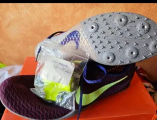 Zapatillas de atletismo para clavos. - Color principal morado con detalles en verde. - Incluye bolsa con clavos de repuesto y herramienta.