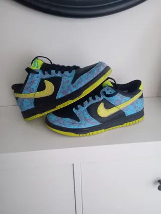 Zapatillas deportivas Nike Dunk Low con un diseño llamativo. - Combinación de colores negro, azul y amarillo. - Detalle de estampado en los paneles laterales. - Swoosh de Nike en amarillo. - Suela de goma. - Cierre de cordones.