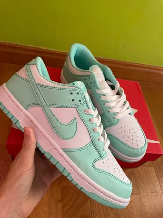 Zapatillas Nike Dunk Low en talla 41. Combinan tonos verde menta y blanco. - Diseño clásico de caña baja. - Detalles de costuras visibles. - Suela de goma.