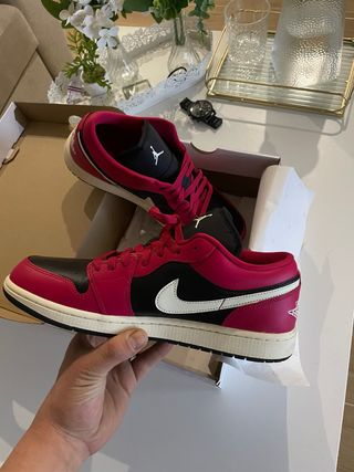 Zapatillas de corte bajo Nike Air Jordan 1. - Combinación de colores rojo y negro. - Detalle de Swoosh blanco. - Logo de Jordan en la lengüeta.