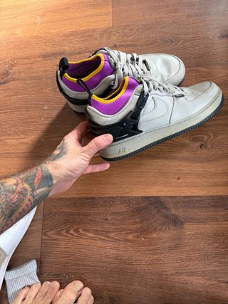 Zapatillas deportivas Nike Air Force 1. - Diseño moderno con detalles en morado y amarillo. - Cierre de cordones.