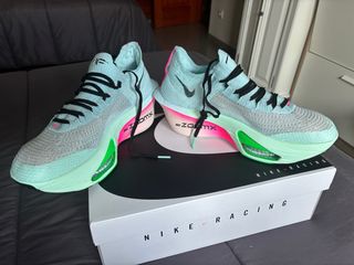 Zapatillas de running Nike Alphafly en talla 44. Un par en color verde brillante y otro en rosa vibrante. - Diseño deportivo. - Cordones negros. Están sin estrenar