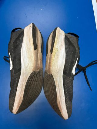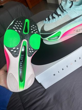 Zapatillas de running Nike Vaporfly 2 en llamativos colores verde y azul. Suela dañada por pisar una piedra corriendo, pero no afecta a su rendimiento.