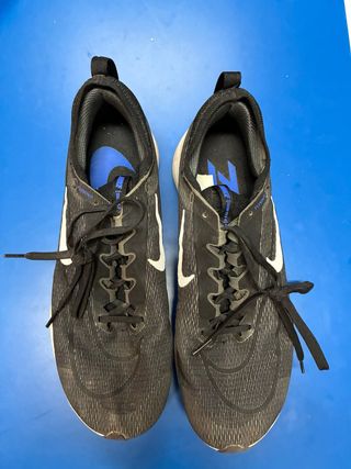 Zapatillas deportivas Nike Zoom Fly en talla 44.5. - Diseño en color negro con detalles en azul. - Parte superior de malla transpirable. - Suela de goma para mayor tracción.