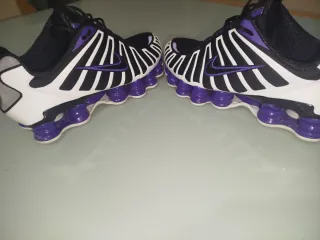 Zapatillas Nike Shox TL en color morado y blanco. Diseño llamativo y moderno. - Parte superior con detalles en blanco y morado. - Suela con tecnología Shox y unidades de amortiguación. - Cierre con cordones -Nuevas