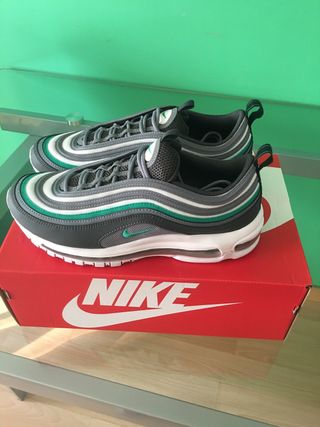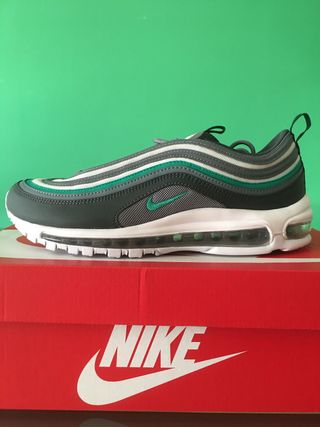 Zapatillas Nike Air Max 97 originales sin entrenar. - Diseño con líneas onduladas. - Combinación de colores gris y verde. - Unidad Air visible en la suela.