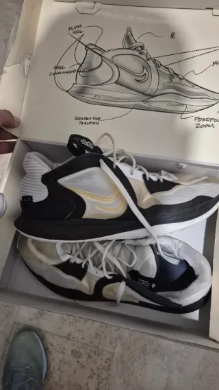 Zapatillas de baloncesto Nike Kyrie Low 5 con uso en un estado 7/10. Siguen agarrando al piso muchísimo. Muy cómodas y ligeras. - Diseño moderno y dinámico. - Combinación de colores blanco y negro. - Detalles en amarillo.