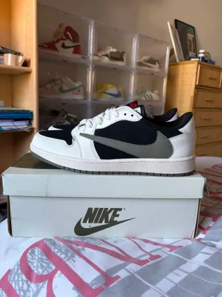Zapatillas Nike Air Jordan 1 Low, colaboración con Travis Scott. - Diseño icónico con detalles distintivos. - Combinación de colores negro, blanco y gris. - Logotipo de Nike en la lengüeta y el talón.