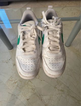 Zapatillas Nike Air Force blancas con detalles en verde. Han sido usadas. - Logotipo de Nike en color verde. - Cierre con cordones.