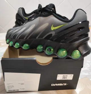 Zapatillas deportivas Nike Air Max DN8 con un diseño moderno y llamativo. - Combinación de colores negro y verde vibrante. - Suela con unidades de amortiguación visibles. - Logotipo Swoosh de Nike en el lateral. - caja sin tapa