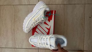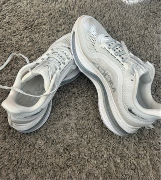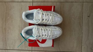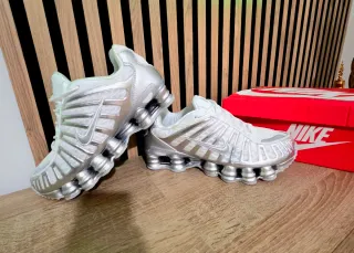 Zapatillas Nike Shox con un diseño moderno y llamativo, buena calidad, talla 41. - Combinación de colores plata y blanco. - Detalle del icónico Shox de Nike.