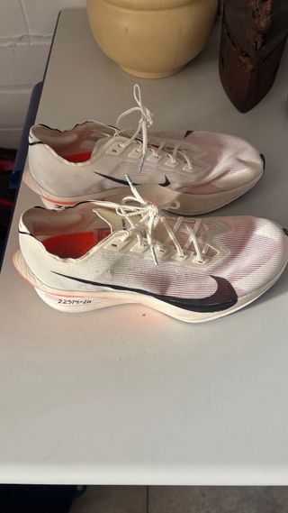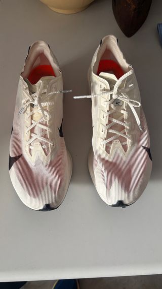 Zapatillas de running Nike Vaporfly 4 en color blanco. Usadas solo en una media maratón. - Diseño ligero y transpirable. - Suela con amortiguación. - Cierre con cordones.