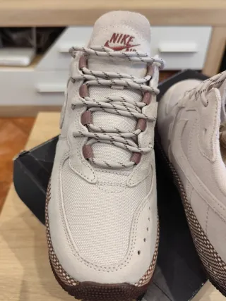 Zapatillas Nike Air Force en tonos beige y marrón. Un diseño clásico con detalles únicos. - Parte superior de ante y lona. - Suela de goma con patrón de espiga. - Costuras decorativas en contraste.