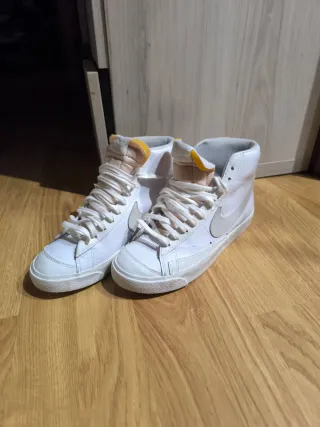 Zapatillas altas Nike Blazer Mid en blanco con detalles en azul. - Diseño clásico de caña alta. - Cierre con cordones. - Logo de Nike en la lengüeta y el lateral.