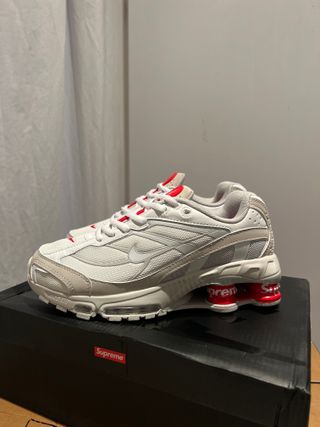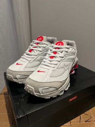 Zapatillas Nike con un diseño moderno y llamativo. - Combinación de colores blanco y plateado. - Detalle de suela con tecnología Shox.