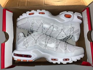 Zapatillas deportivas Nike Air Max Plus TN SE en color blanco y detalles naranjas. - Diseño moderno y llamativo. - Suela con amortiguación visible. - Cordones con sistema de ajuste. - Malla transpirable en la parte superior.