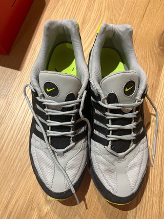 Zapatillas deportivas Nike Air Max en tonos grises y negros. Perfectas para el día a día. - Diseño moderno y cómodo. - Detalle de logo Nike en el lateral. - Suela con amortiguación. - Cierre con cordones.