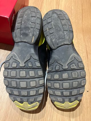 Zapatillas Nike Air Max en color negro con detalles dorados. Diseño moderno y llamativo. Hago envíos por wallapop a través de correos. - Parte superior con texturas. - Suela gruesa con amortiguación visible. Usado pero en buen estado.
