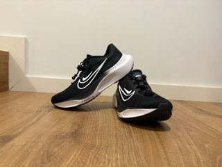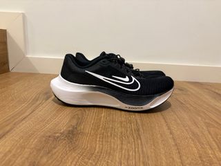 Zapatilla deportiva ZOOM Nike Fly 5 talla 40,5. Es una oportunidad solo 5km. Se vende por error de talla. Equipada con cordones elásticos nuevos. Se puede ver que esta nueva con la foto de la plantilla interior, la pegatina esta intacta. - Diseño en color negro con detalles blancos. - Suela con tecnología Zoomx