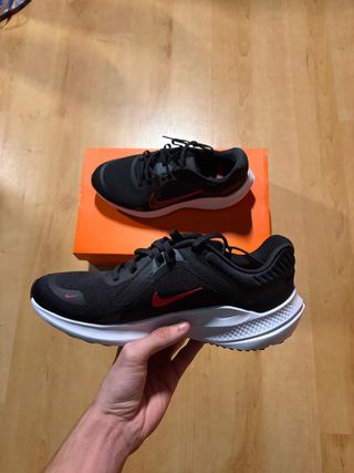 Zapatillas Nike originales, talla 40, en color negro con logo rojo y suela blanca. Diseño cómodo y ligero, ideales para uso diario, caminar o entrenar.