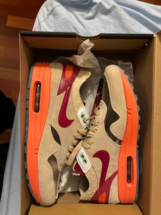 Zapatillas Nike Air Max con un diseño llamativo. - Combinación de colores beige y naranja. - Detalles en color burdeos. - Suela con unidad Air visible.