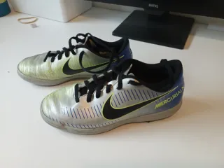 Zapatillas de fútbol Nike MercurialX en talla 34. Diseñadas para un buen agarre y control en la cancha. - Parte superior plateada con detalles en azul y verde lima. - Cierre de cordones negros. - Logo de Nike en los laterales.