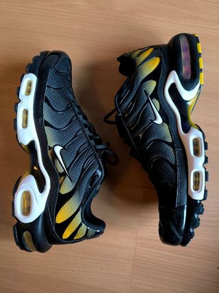 Zapatillas Nike Air Max Plus con un diseño llamativo. Usadas una sola vez. - Parte superior de malla transpirable. - Detalles en color amarillo degradado. - Suela con unidades de amortiguación visibles.