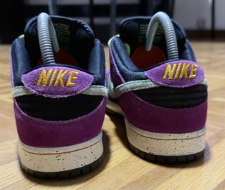 Zapatillas Nike SB Dunk Low Pro con un diseño llamativo. - Combinación de colores morado y verde. - Cordones de color verde brillante. - Suela blanca con detalles moteados.