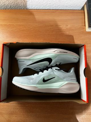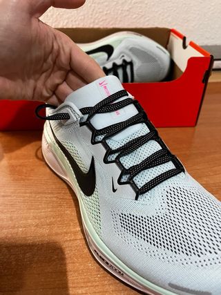 Zapatillas de correr Nike Pegasus en color negro con detalles blancos. Diseñadas para ofrecer comodidad y rendimiento. - Parte superior de malla transpirable. - Suela con amortiguación Air Zoom. - Cierre de cordones. - Logo de Nike en el lateral. Están prácticamente nuevas, las habré usado unas 5 veces únicamente.