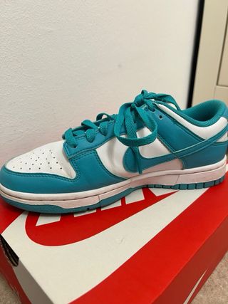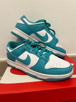 Zapatillas Nike Dunk Low originales para jóvenes (GS) en una atractiva combinación de colores verde azulado y blanco. - Diseño clásico de caña baja. - Detalles de cuero sintético.